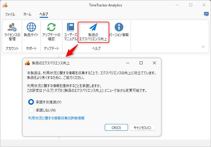 [製品のエクスペリエンス向上]ダイアログより情報提供の承諾する、しないを選択してください。