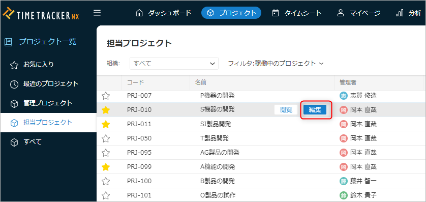 その後、対象プロジェクトの「編集」や「閲覧」をクリックする事で、対象のプロジェクトを開くことができます。