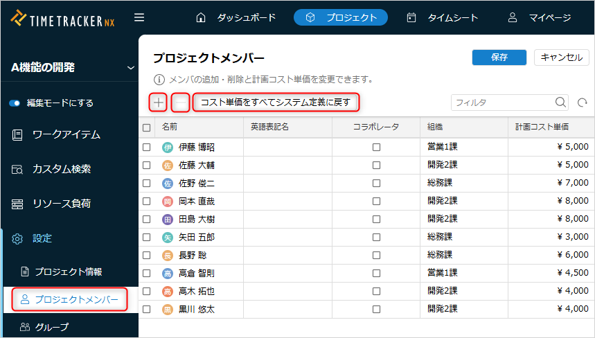 メンバーの計画コスト単価がプロジェクトにより異なる場合は、プロジェクト側で変更することができます。