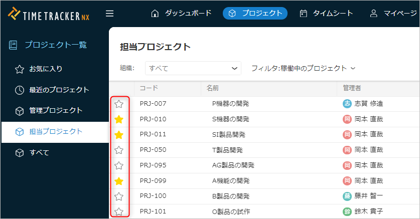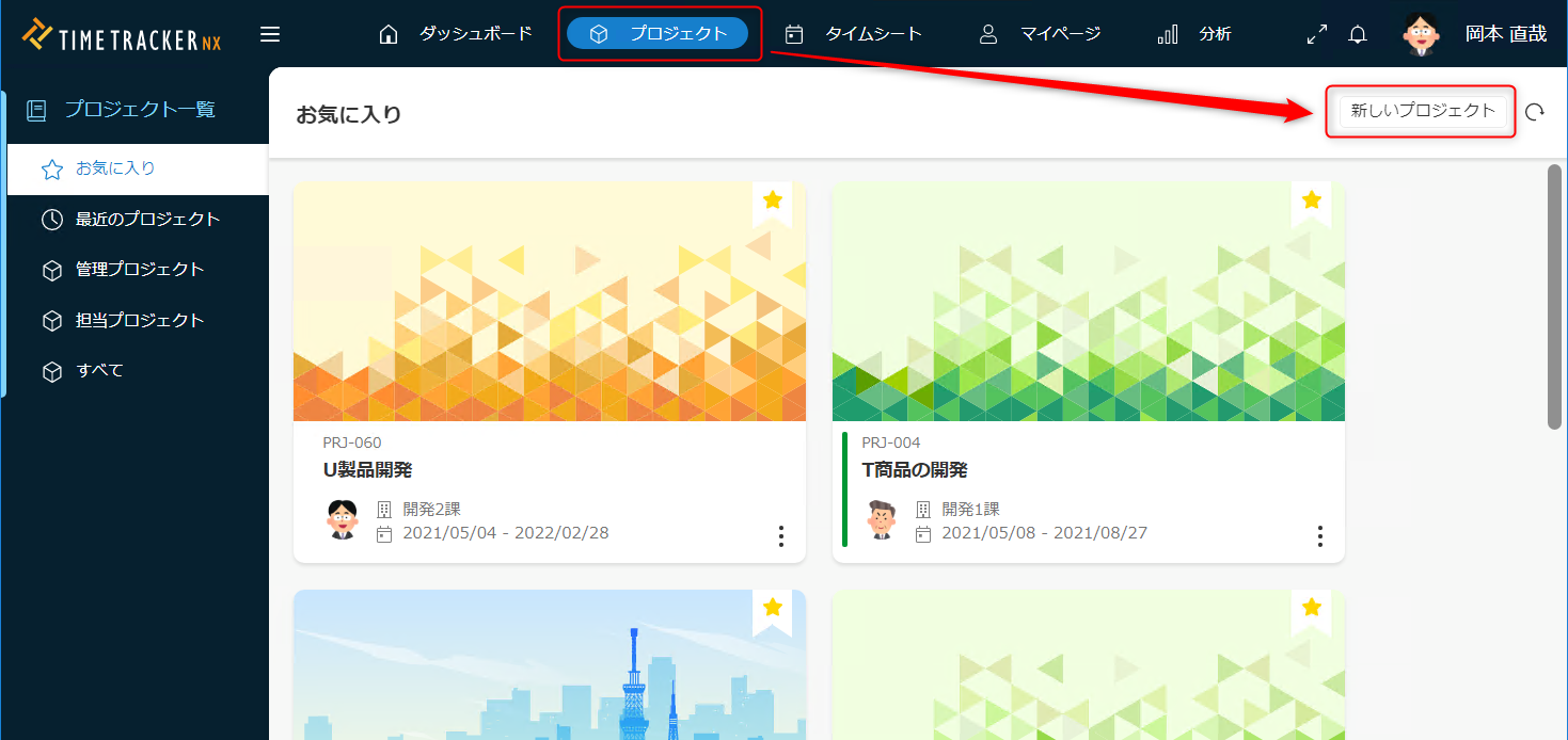 予めよく使用するプロジェクトを登録することで、効率よく対象プロジェクトを探すことができるようになります。