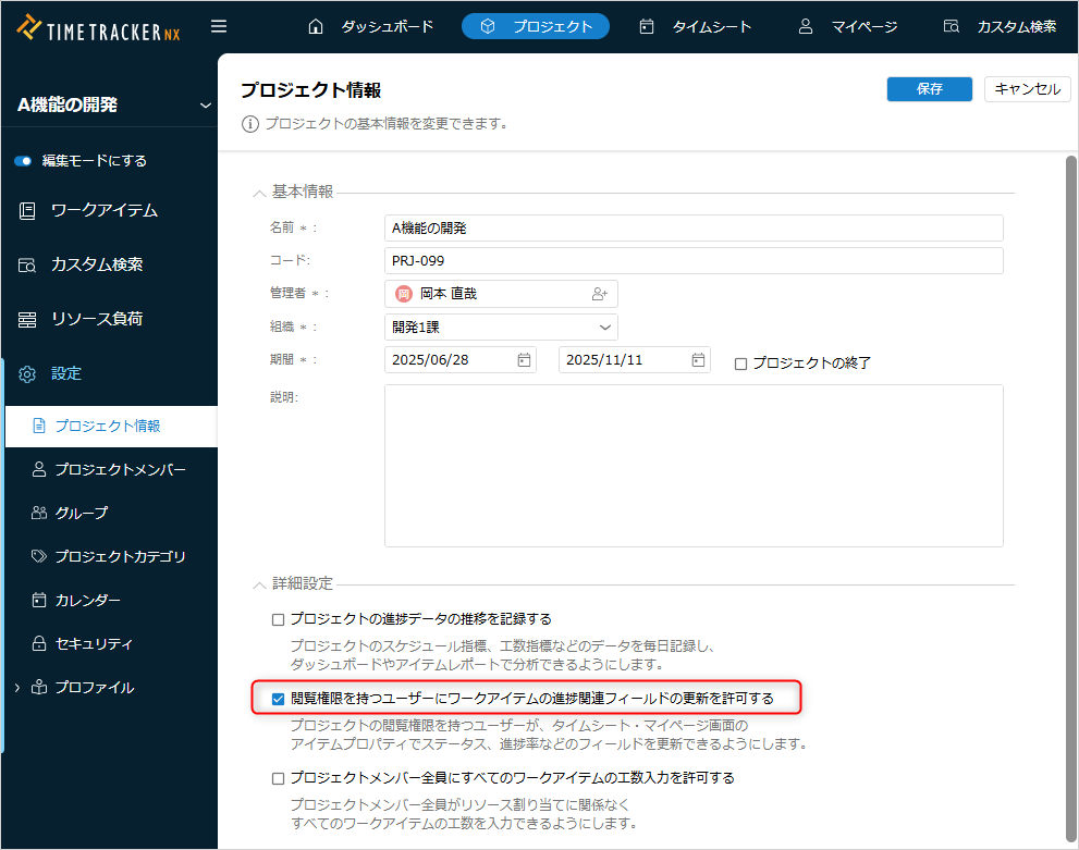 作成したプロジェクトに対して以下を設定することで、各メンバーが入力する実績とプロジェクトのデータが紐付きます。