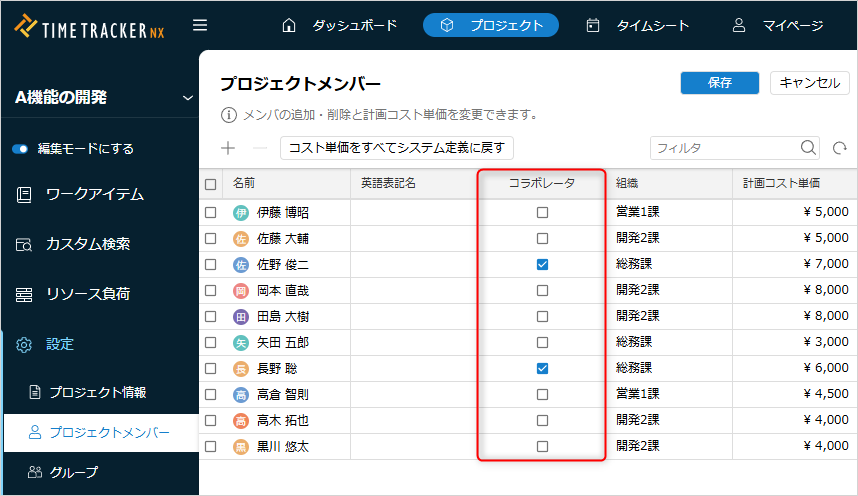 コラボレータに割り当てられたメンバーは、各メンバーのタイムシートで「コラボレータのアイテムを含む」をチェックしてください。