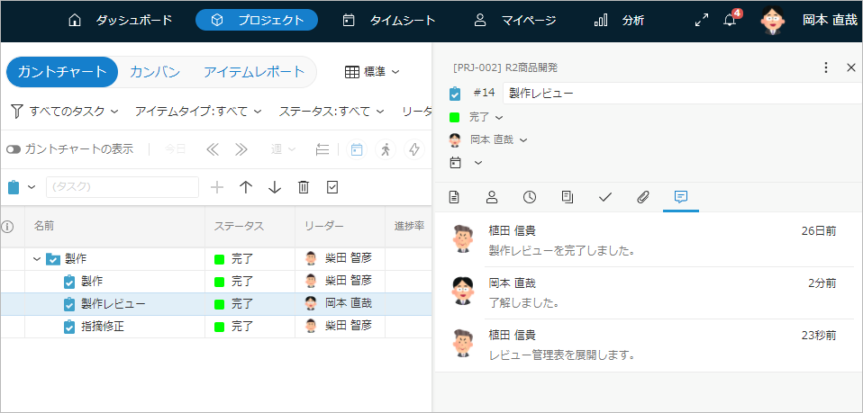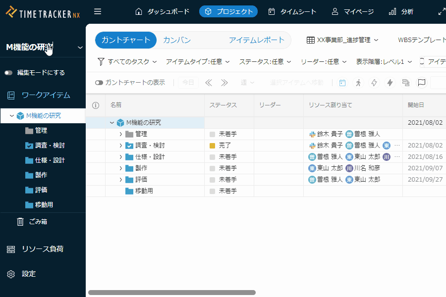 ガントテーブル画面でプロジェクトのワークアイテムを追加し、以下を実施できます。