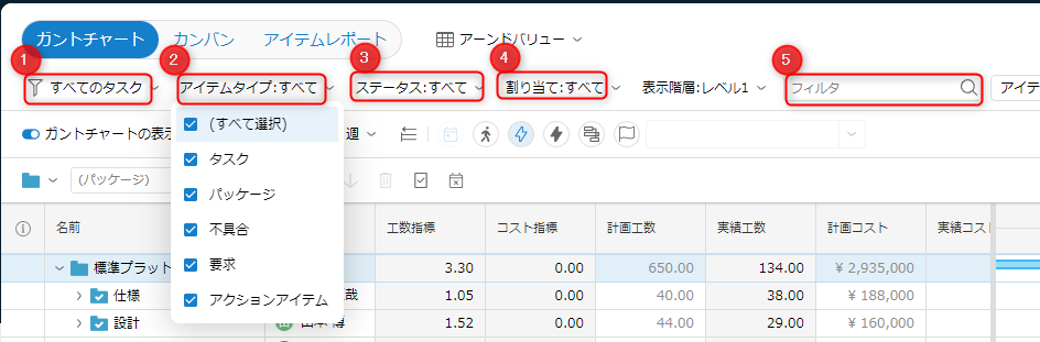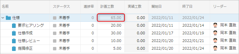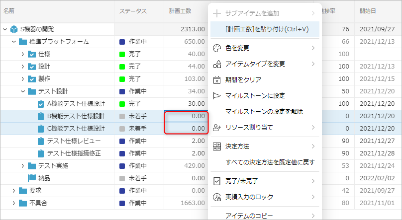 ワークアイテムの情報(期間や計画工数など)を入力することで、プロジェクトの計画を立てます。
