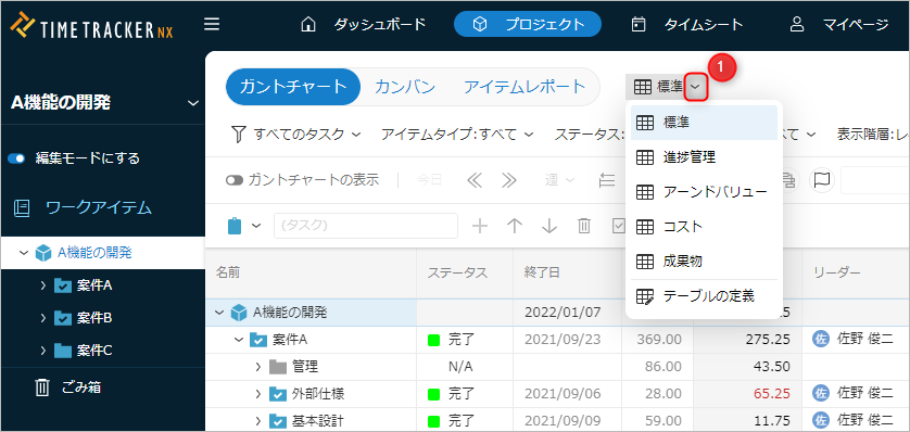 管理したい観点(「進捗管理」「成果物」「コスト」など)でテーブルを切り変えて管理しましょう。