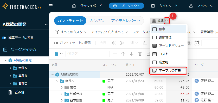 進捗管理や状況確認の場面に合わせて、プロジェクトで表示す るフィールド(列)の構成を変更することができます。