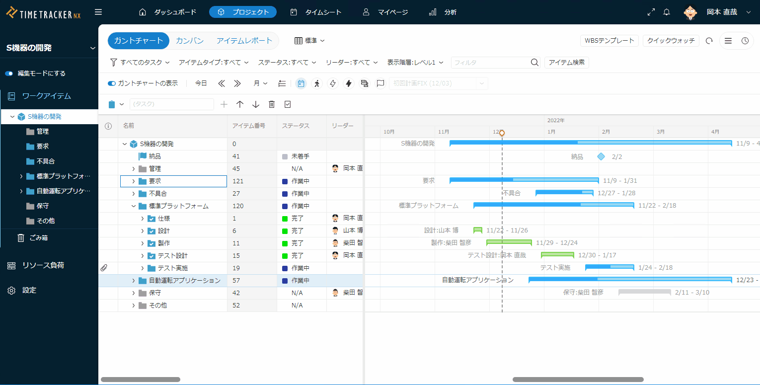 プロジェクトの進捗状況をガントチャート上で見える化して確認することができます。