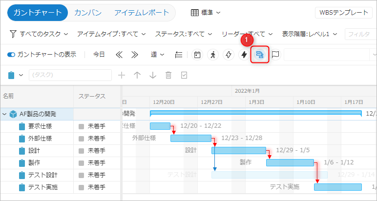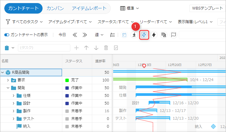クリティカルパスを表示することで、進捗管理における重要なワークアイテムを簡単に確認することができます。