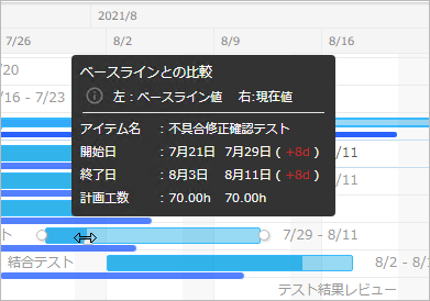 カーソルをガントチャートの対象ワークアイテムに移動すると、ベースラインとの差分がポップアップ画面で表示されます。