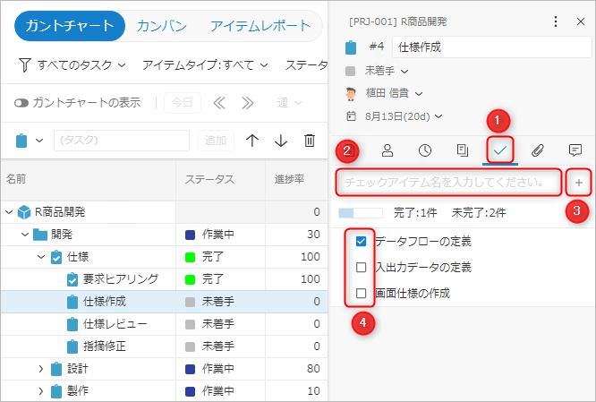 プロジェクト画面で各アイテムの「進捗率」も更新でき、以下の場面で活用できます。