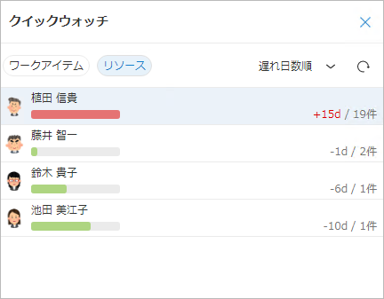 - タスクを作業の遅れが大きい順や期日の近い順に並べて一覧表示できるため、
