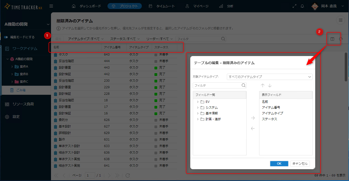 削除アイテム用のガントテーブルは、デフォルトのフィールド(①)に加え、 ②の方法で追加できます。