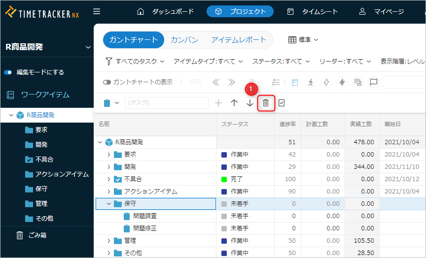 - 実績工数のあるワークアイテムは、削除することができません。