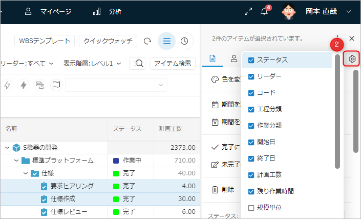 まずは対象とするワークアイテムを選択し、ローカルナビの「アイテムプロパティ」アイコン①をクリックしてください。
