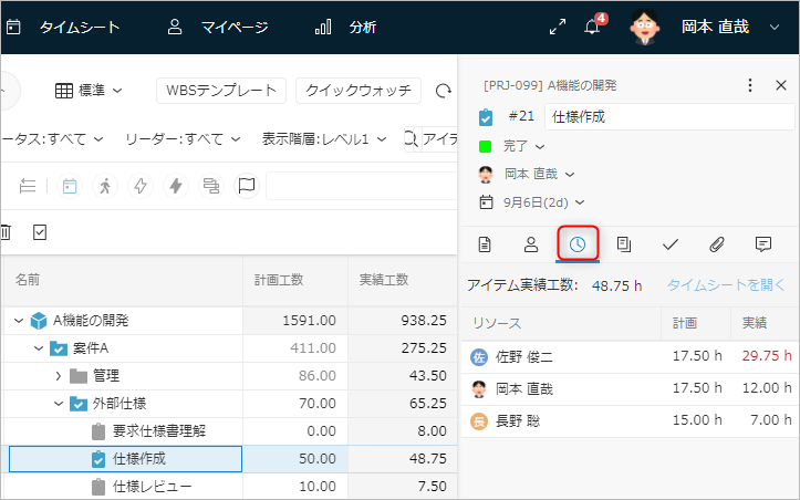 - 計画工数を超過し、赤字になった実績工数のユーザーに対して、タイムシートを開いて詳細を確認する。