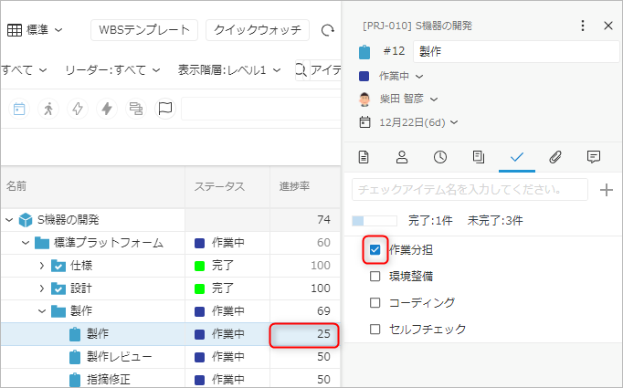- チェックアイテムを完了にすると、進捗率に自動で反映され、進捗管理に利用することができます。