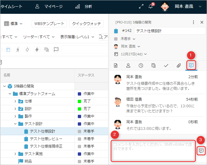 - 登録したコメントはプロジェクトにリアルタイムに反映されます。