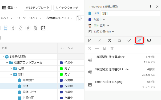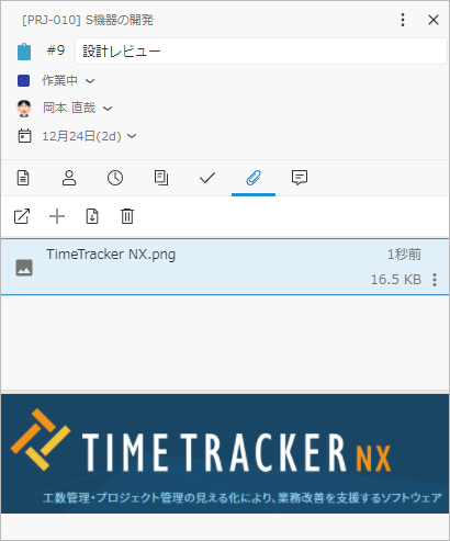 ワークアイテムに成果物や関連する資料を添付して TimeTracker NX 上でまとめて管理することができます。