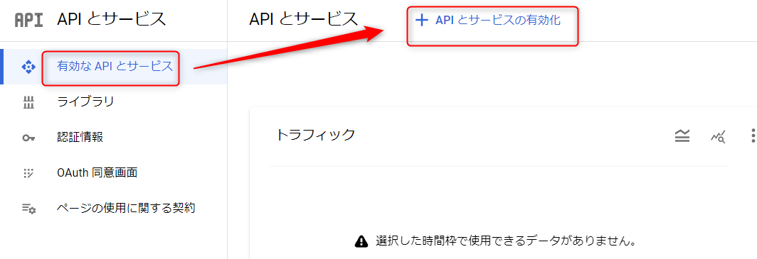 ダッシュボードの「APIの概要に移動」をクリックし、移動先の画面で「APIとサービスを有効化」をクリックする。