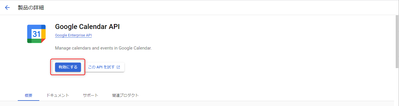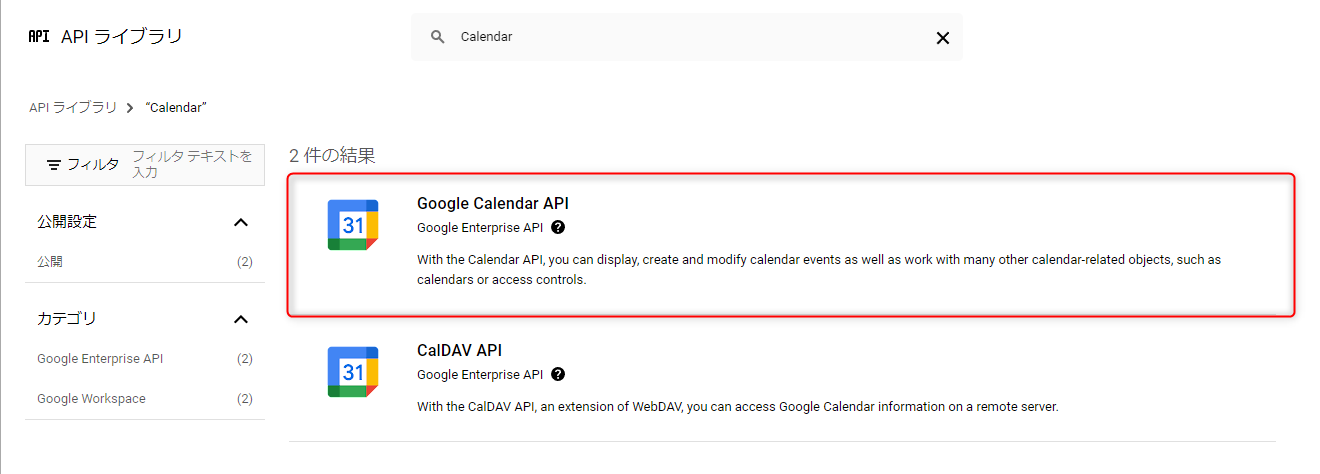 検索欄に『Calendar』と入力して『Google Calendar API』をクリックし、APIを有効にする。