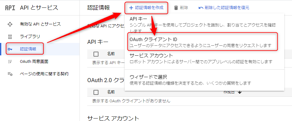 ダッシュボードにて「OAuth同意画面」をクリックし、「認証情報を作成」→「OAuthクライアントID」を選択する。
