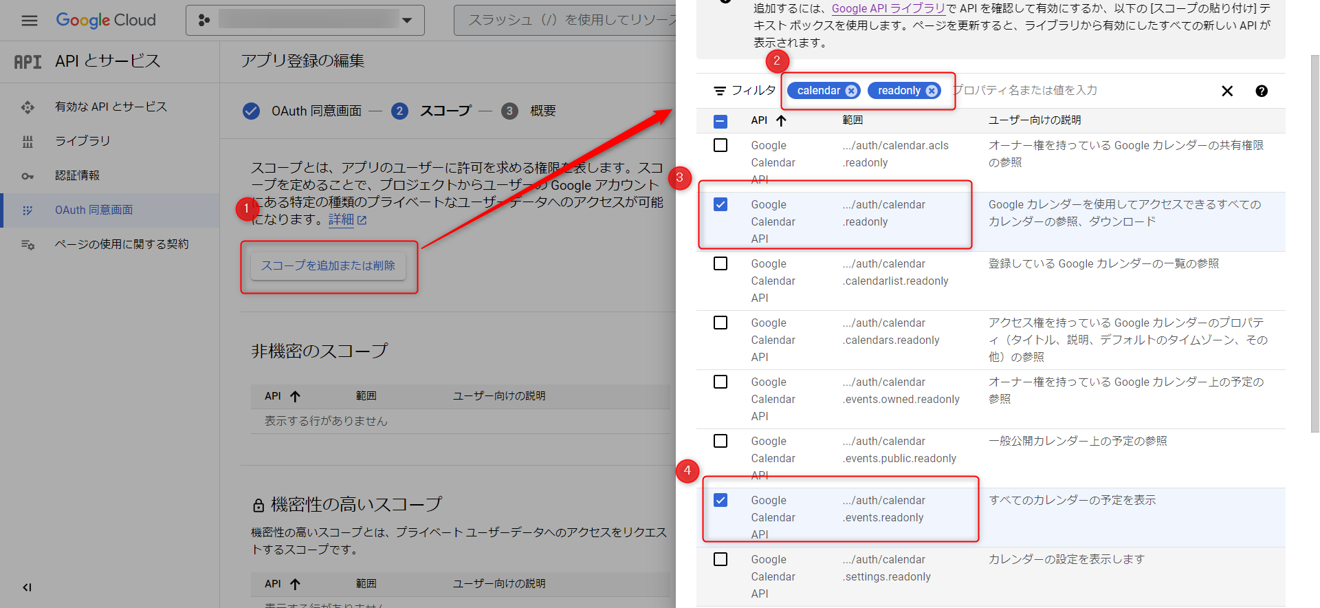 - ③、④:選択するスコープは以下です。