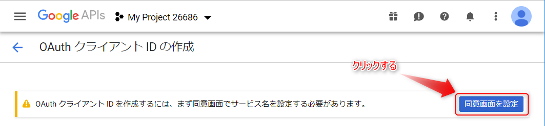 OAuthクライアントID 作成画面で、「同意画面を設定」をクリックする。