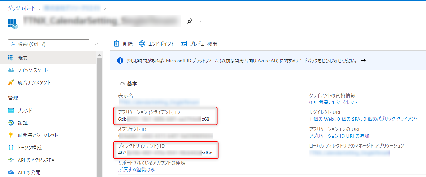 ・ディレクトリ(テナント)ID (「サポートされているアカウントの種類」で"シングルテナント"を選択した場合)