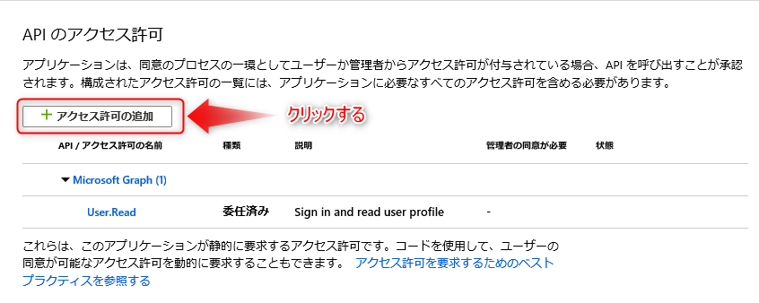 「APIのアクセス許可」を選択し、「アクセス許可の追加」をクリックしてください。