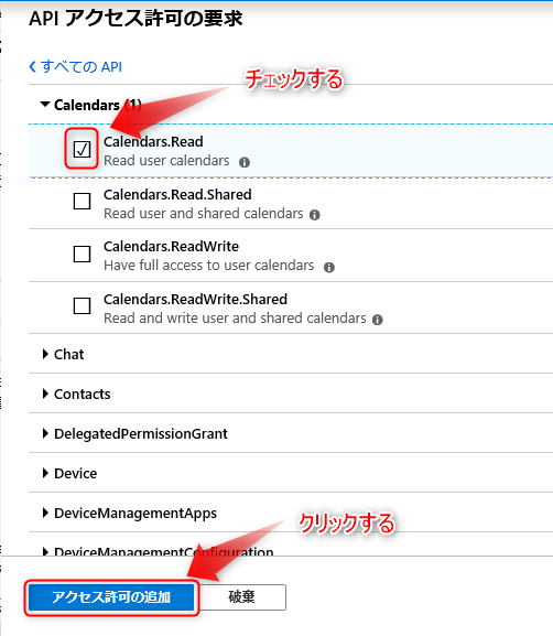「Calendars」→「Calendars.Read」を選択してください。