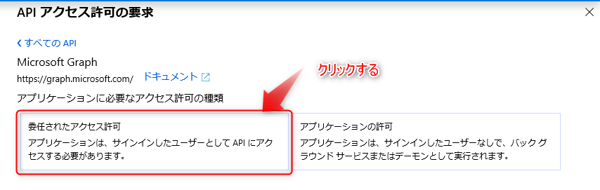 「アプリケーションに必要なアクセス許可の種類」から「委任されたアクセス許可」を選択し、