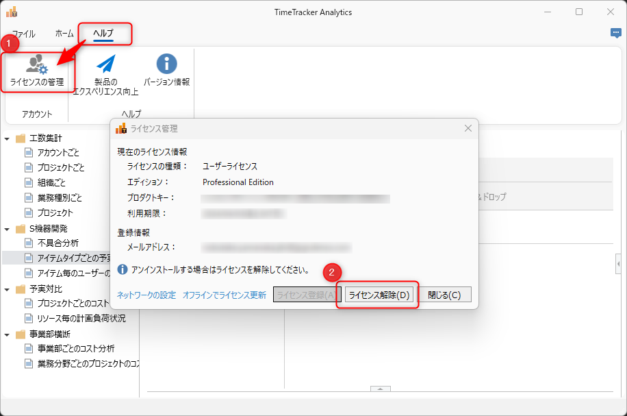 - 2の一覧を TimeTracker NX サポートに送付し、ライセンス解除を希望する旨お申し付けください。