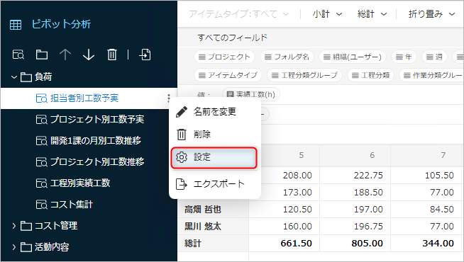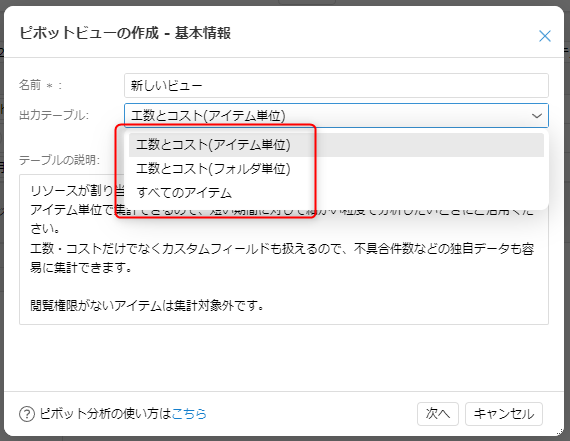 「工数とコスト」の場合:分析テーブルの種類(アイテム単位/フォルダ単位)により対象が変わります。