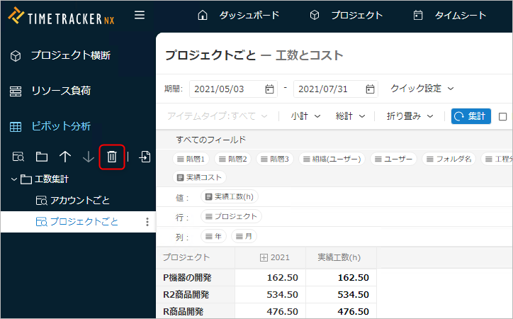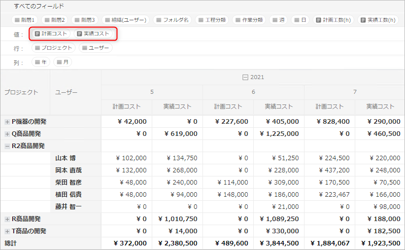 プロジェクトに所属するユーザーの実績コストを年/月単位で集計する場合は、以下のように設定します。