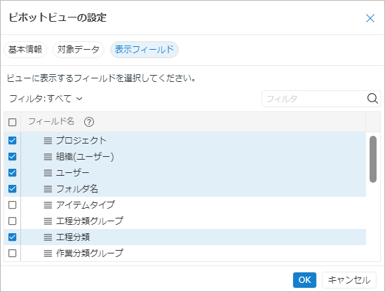 「ピボットビューの作成 - 表示フィールド」ダイアログで、利用するフィールドをチェックする。
