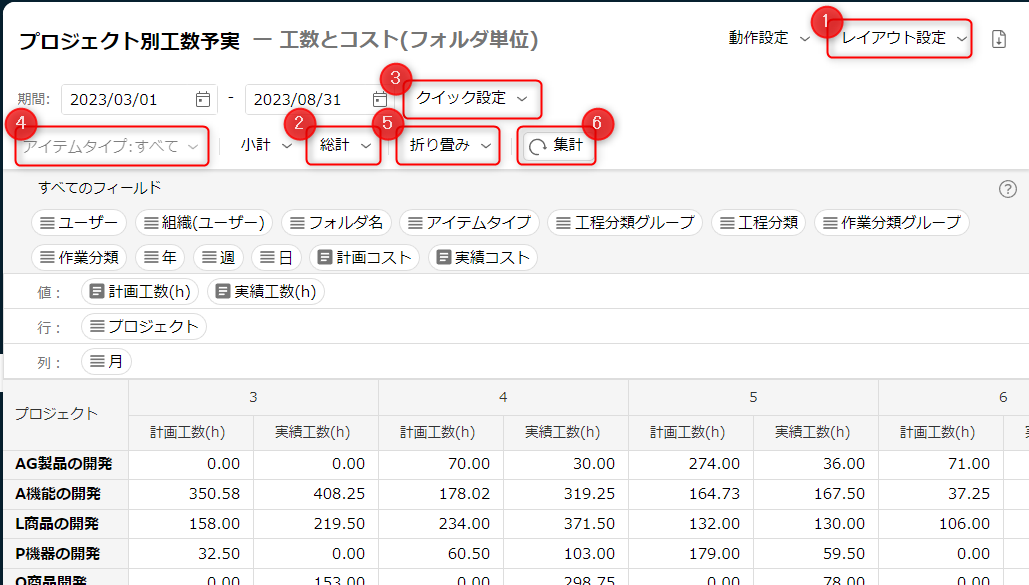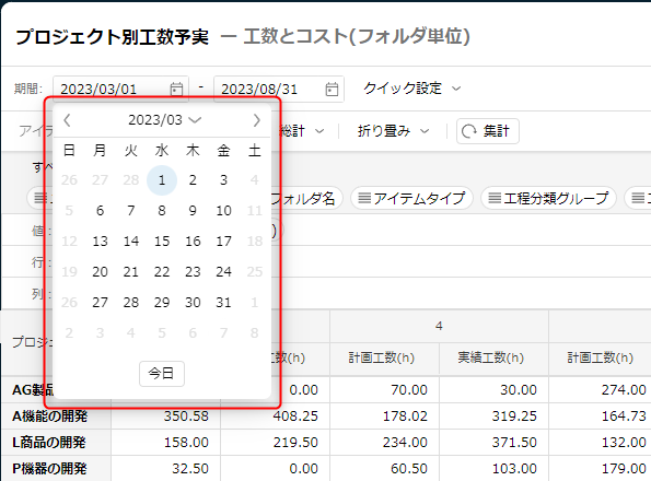チェックしない場合は、集計したいタイミングで「集計」ボタンをクリックしてください。「工数とコスト」の出力テーブルで使用できます。 -