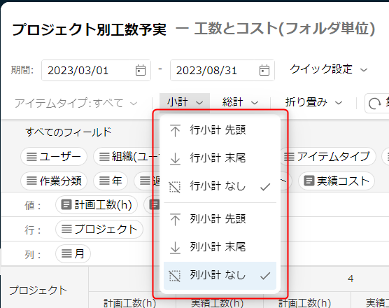 出力テーブル: 「すべてのアイテム」の場合、期間は関係なく選択したプロジェクトの最新状態を集計します。