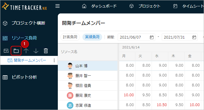各メンバーの実績の負荷(実績工数)を確認することができます。