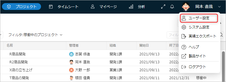 表示されたメニューから「ユーザー設定」を選択する。