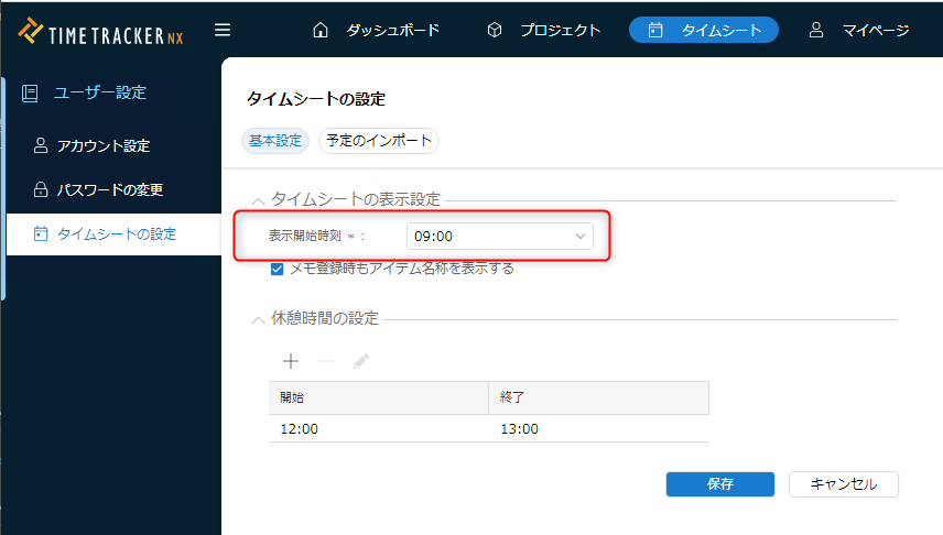 | 3 | タイムシートの設定を変更する | タイムシートの表示開始時刻と休憩時間を設定します。 |