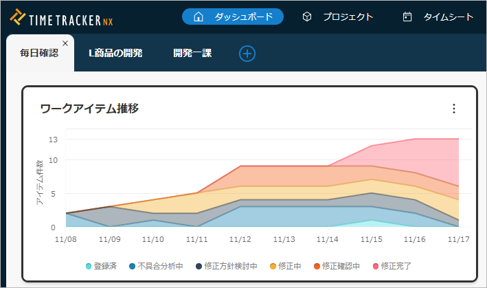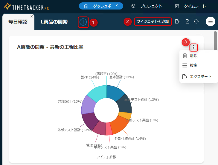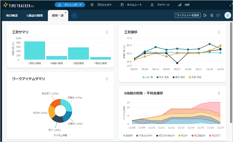 ダッシュボードは、プロジェクトの進捗状況、工数の入力状況などを簡単にモニタリングできる機能です。