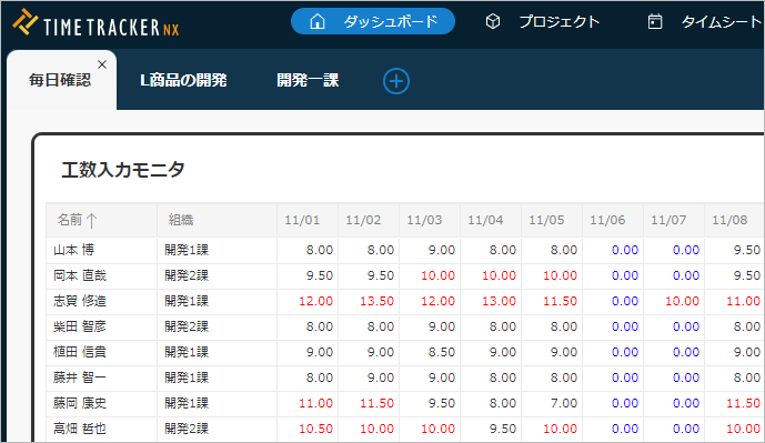 工数入力モニタウィジェットでは、実績工数の入力状況をモニタリングすることができます。