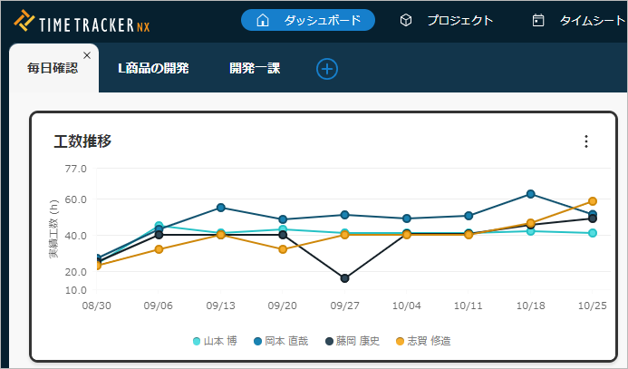 ユーザーやプロジェクトの工数の推移を簡単に確認することができます。