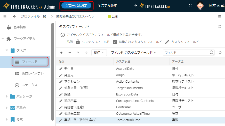 プロファイルの「ワークアイテム」-「特定のアイテムタイプ」-「フィールド」 画面を開きます。