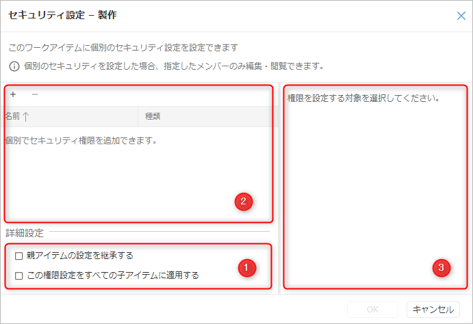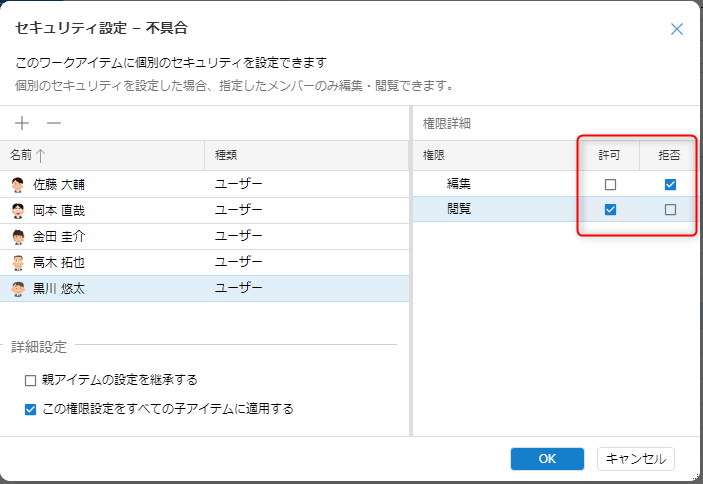 対象の権限を設定し、「OK」ボタンをクリックしてください。個別のセキュリティを設定した場合、指定したメンバー以外はアイテムを参照できなくなります。プロジェクトのセキュリティで閲覧権限を付与しても、下図ダイアログで登録していないメンバーは対象アイテムを参照できません。