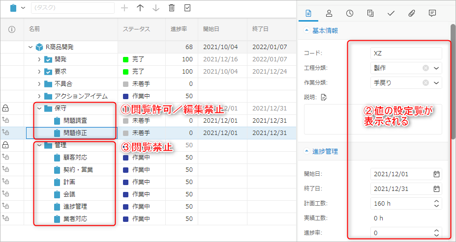 TimeTracker NX ではプロジェクト内のアイテム単位でアイテムの「編集」、「閲覧」権限を設定することができます。
