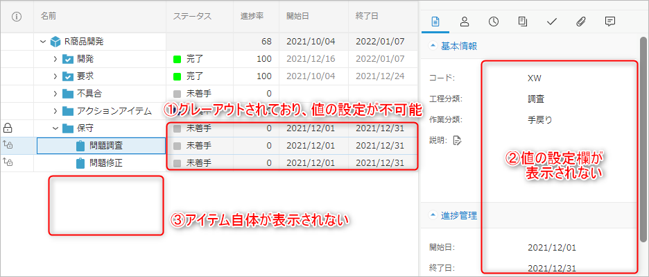 - 編集禁止のアイテム:ガントテーブル、アイテムプロパティ供に編集できない(下図①,②)