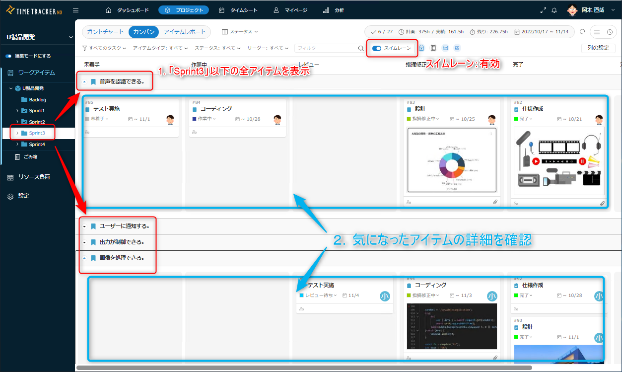 詳細は次のリンクを参照ください。: 「スイムレーンで横断してアイテムを表示する」カンバンの表示モードが「ステータス」の場合に表示します。 -