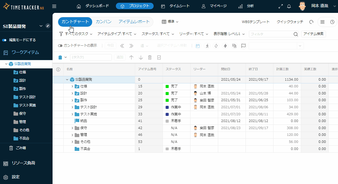 以下のフィルタがありますが、動作はガントテーブル画面と同じです。