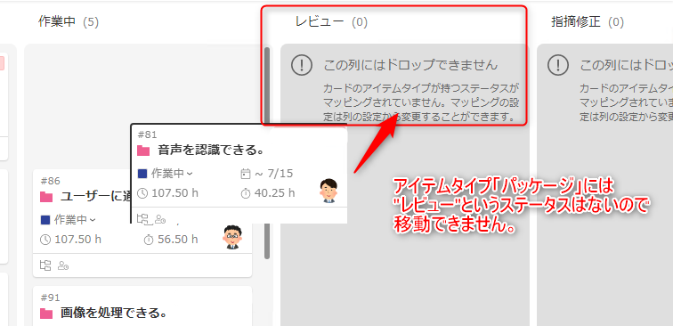 ワークアイテム画面で作成したアイテムをカンバンのビューで表示できます。